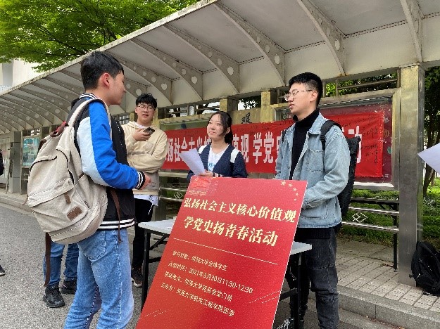 活动中,学院团委学生干部在宣讲社会主义核心价值观以及党史知识的同时,邀请同学们参与知识竞答,参与的同学们认真聆听,积极互动,并在宣传横幅上签名留念。