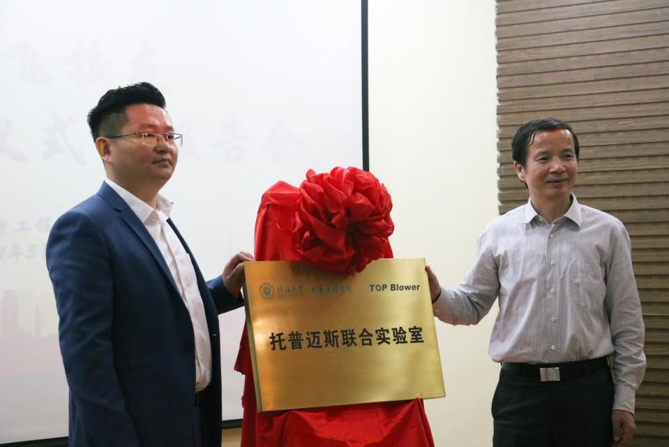 捐助仪式开始,学院党委副书记董涌波老师向同学们介绍了贾玉飞校友,并对校友资助学院10万元支持学生组织活动的开展表示衷心的感谢。随后,学院党委书记刘丹平老师向同学们简要介绍了贾玉飞校友创办的江苏托普迈斯涡轮机械设备有限公司,并向贾校友颁发了兼职教授聘书,两人共同为托普迈斯联合实验室揭牌。