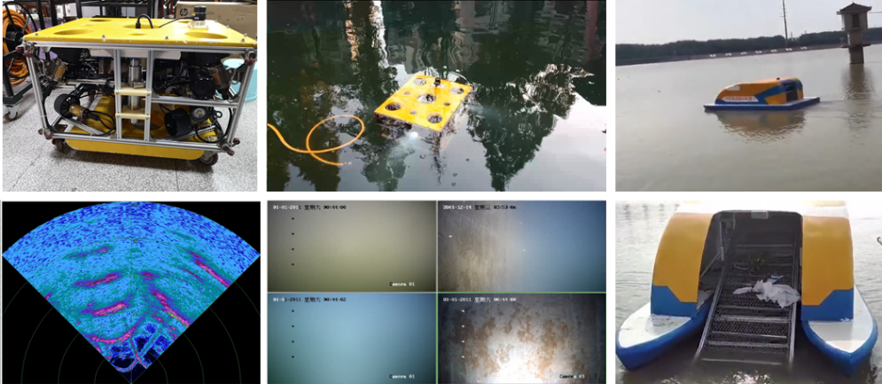 针对大中型水电站、大坝、桥梁的修建与维护、近海资源探测以及湖泊、河道进行治理的需求,本学科机器人系统科研团队依托江苏省特种机器人重点实验室,研制了水下构筑物探测机器人系统以及水质监测与垃圾清理相关的水面清理特种机器人。