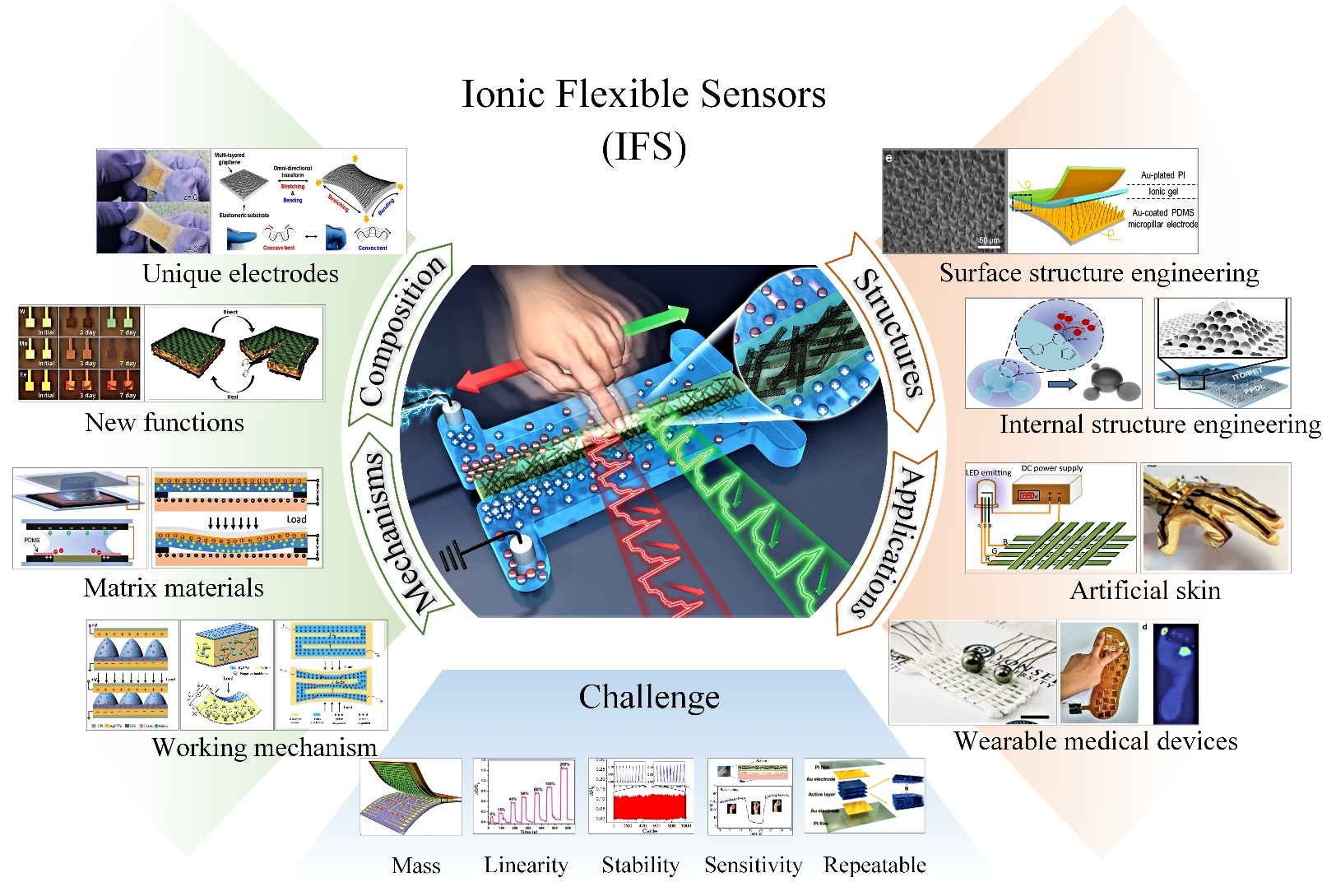 人体皮肤是人体最大的感觉器官,可以感知压力、应变、温度和湿度。通过模仿人类皮肤的触觉感知功能,基于离子迁移和离子重分布机制的离子柔性传感器得到了飞速发展。与传统柔性传感器相比,离子柔性传感器不仅具有高灵敏性、高抗噪性、高分辨率,且具有自修复、自供电和生物相容性等生物学特性,在电子皮肤、人机交互、可穿戴医疗设备等领域具有重要的应用及学术价值。该文详细回顾了几种典型的离子柔性传感机制及结构组成,并通过耦合模型讨论了其传感性能的影响因素,包括超级电容界面离子传感效应、压电式离子传感效应和压阻式离子传感效应。其次,基于可生物降解性、自愈性和多模态性等生物学特性,重点讨论了固体离子聚合物基体、金属基电极、非金属基电极和微结构设计在离子柔性传感器中的应用及改进策略。然后,探讨了离子柔性传感器在人工皮肤、人机交互技术、可穿戴设备等相关领域的典型应用。最后,提出了离子柔性传感器当前面临的挑战和未来发展趋势,为离子传感器的发展提供可参考的技术路线图。