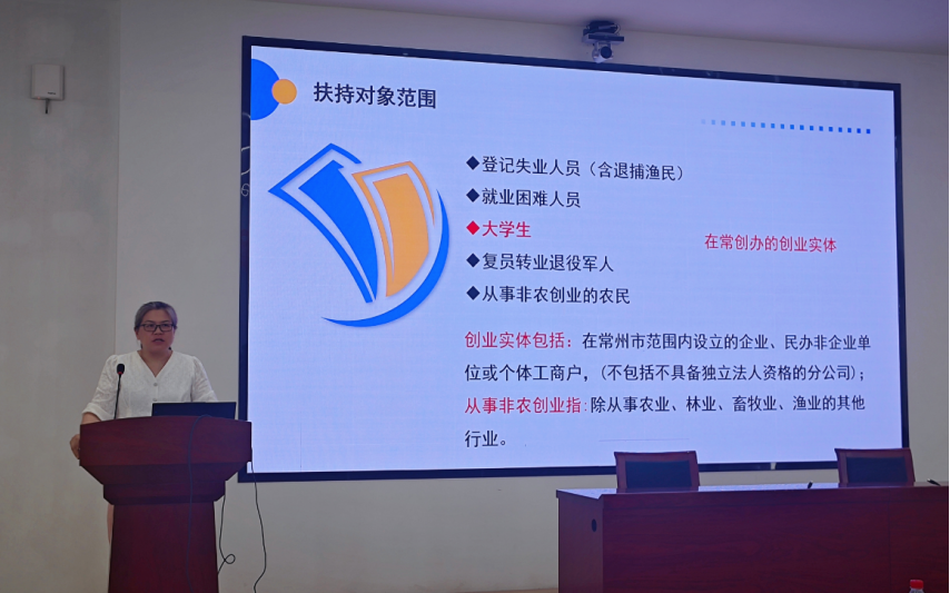 常州市金坛区就业和人力资源服务中心创业服务科蔡丽丽结合生动的案例介绍了金坛区创业扶持政策,从创业前期的“第一桶金”支持,到创业过程中的“加速器”助力,再到创业成功后的“助推器”加持,进行了全景式、链条化的解读,增强了同学们将创新火花转化为市场价值的信心与底气。